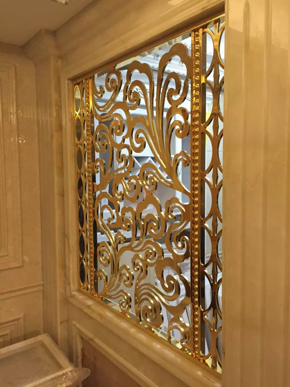 仿古銅鋁藝雕花屏風不僅可以發揮出傳統屏風的隔斷作用,且再實際應用性方面有了更為廣泛的拓展,比如傳統屏風可以進行隔斷功能,將化妝間,更衣室等地方的完美隔離,又增添美感。鋁藝雕花屏風除了擁有有效分隔空間、實現空間化利用的作用,同時還有傳統屏風不具有的特點與風格,更加經久耐用,造型豐富多樣,設計獨特而時尚,可作為一些高檔場所的裝飾使用,提升空間結構感,增加場所整體的厚重與大氣氛圍。